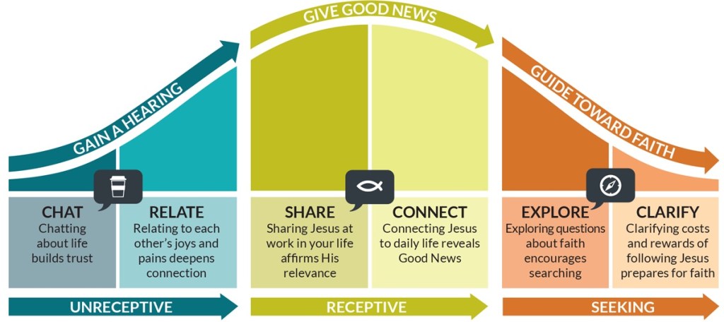 Third, eager conversationalists are “open to sharing their faith in a wide variety of ways.” This openness takes into account whether our conversation partners’ spiritual posture is “unreceptive,” “receptive,” or “seeking.” In turn, our “prayerful response” to them seeks to “gain a hearing,” “give good news,” or “guide toward faith,” respectively. Depending on the relationship dynamic, our conversation may take one of six forms: “chat,” “relate,” “share,” “connect,” “explore,” or “clarify.” Lutheran Hour Ministries calls this dynamic the “Spiritual Conversation Curve.” (See figure below.)