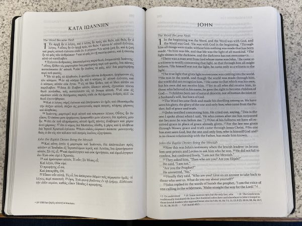 Nearly 30 years past my seminary education, I found that my facility with the Greek New Testament was much diminished. I purchased the NIV Greek and English New Testament to remedy that situation. It presents the Greek text underlying the New International Version (NIV) translation on facing pages. (See picture.) I find that this presentation makes it easier for me to determine what Greek words I need to focus on as I write articles or prepare sermons (for those occasions when I preach).